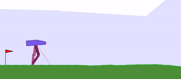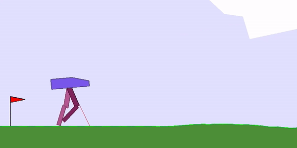一只两足“生物”,要在随机生成的道路上往前走,越过凸起,跨过陷坑。奖励多少,就看它从出发到挂掉走了多长的路,以及电机扭矩的成本 (为了鼓励高效运动) 。