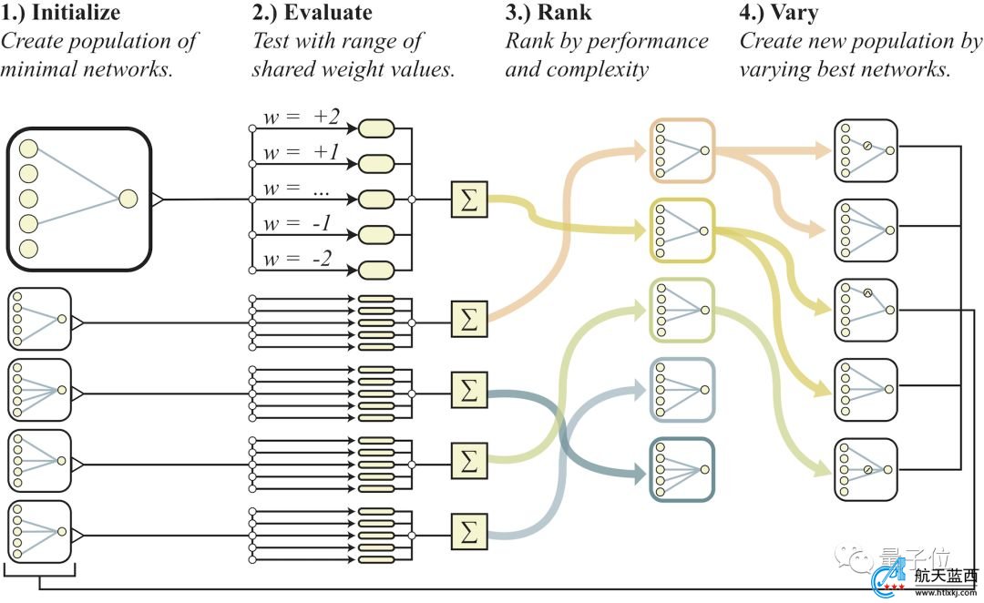然后,算法从第2步开始重复,在连续迭代中,产生复杂度逐渐增加的权重不可知拓扑(weight agnostic topologies )。